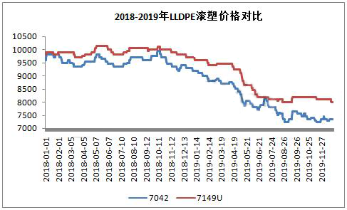 ????????從圖中顯示,2018-2019年國(guó)內(nèi)滾塑料價(jià)格明顯高于普通線(xiàn)性,且價(jià)格差距逐步擴(kuò)大,2019年較普通線(xiàn)性高50-850元/噸。目前國(guó)內(nèi)聚烯烴行業(yè)產(chǎn)能過(guò)剩,國(guó)內(nèi)石化一直致力于高端產(chǎn)品研發(fā),搶占高端領(lǐng)域,以獲取較大利潤(rùn)。從線(xiàn)性區(qū)域來(lái)看,由于產(chǎn)能過(guò)剩,7042價(jià)格近兩年一直處于下行通道,削減了石化利潤(rùn)。線(xiàn)性行業(yè),近年來(lái),研發(fā)主要方向集中在C8線(xiàn)性,茂金屬、滾塑料等,其中滾塑料做為一個(gè)分支,近年研發(fā)較多。