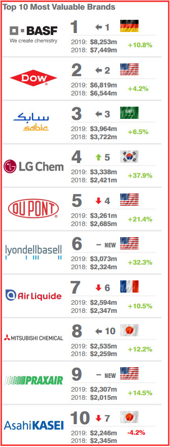 2019年的新進入者是美國的利安德巴塞爾(LyondellBasell ),品牌價值上升32%,達到31億美元,排名第六。第7-10為分別是:法國液化空氣集團、日本三菱化學、美國普萊克斯和日本旭化成。